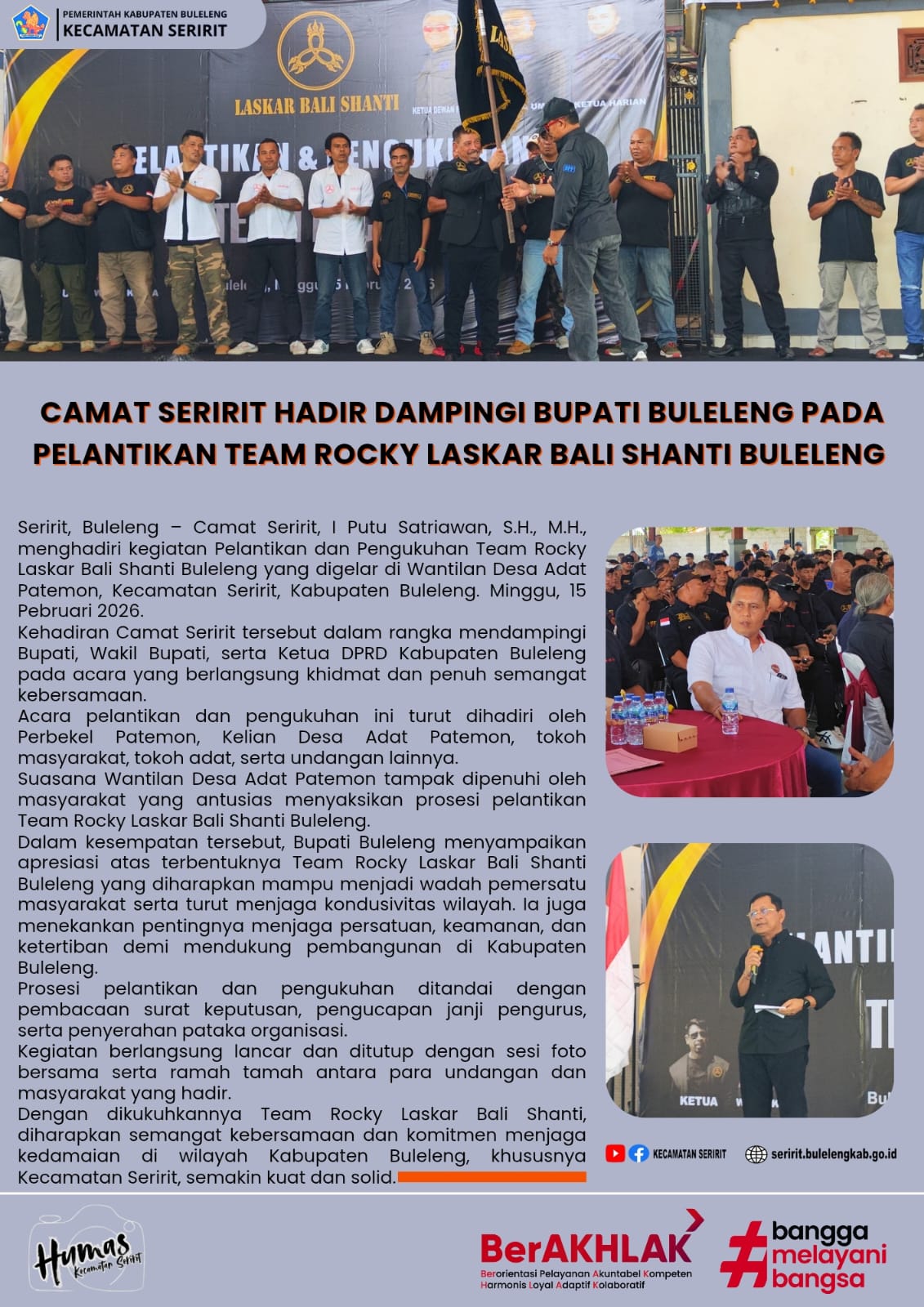 Seririt, Buleleng – Camat Seririt, I Putu Satriawan, S.H., M.H. menghadiri kegiatan Pelantikan dan Pengukuhan Team Rocky Laskar Bali Shanti Buleleng yang digelar di Wantilan Desa Adat Patemon, Kecamatan Seririt, Kabupaten Buleleng. Minggu, 15 Pebruari 2026.