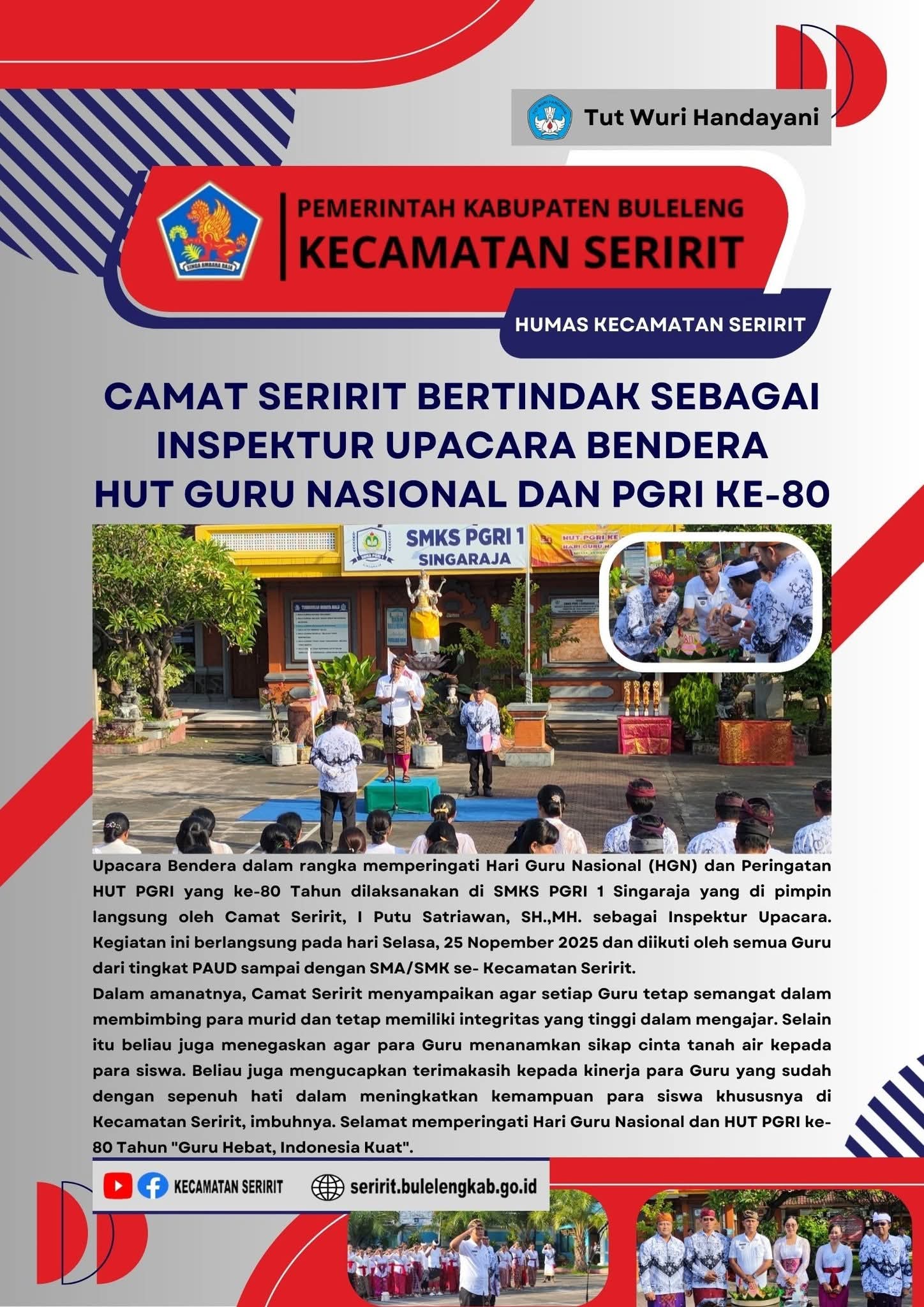 Hari Ulang Tahun ke-80 Persatuan Guru Republik Indonesia dan Hari Guru Nasional (HGN) 2025 yang digelar pada 25 November. pada kesempatan ini kecamatan seririt menyelenggarakan kegiatan apel peringatan HUT PGRI ke 80 Dan Hari Guru Nasional tahun 2025, berlangsung di SMKS PGRI 1 Singaraja. Camat Seririt I Putu Satriawan,S.H.,MH. bertindak selaku pembina apel.