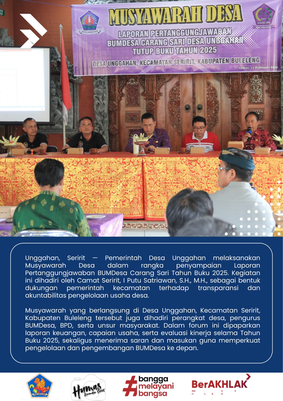 Unggahan, Seririt - Pemerintah Desa Unggahan melaksanakan Musyawarah Desa dalam rangka penyampaian Laporan Pertanggungjawaban BUMDesa Canang Sari Tahun Buku 2025. Kegiatan ini dihadiri oleh Camat Seririt, I Putu Satriawan, S.H.,M.H. sebagai bentuk dukungan Pemerintah Kecamatan terhadap transparasi dan akuntabilitas pengelolaan usaha Desa.