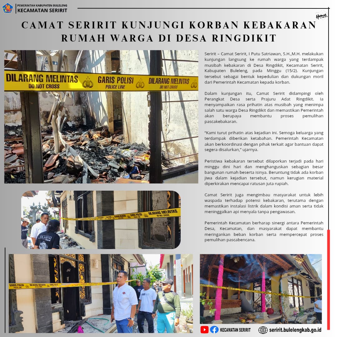 Dalam kunjungan itu, Camat Seririt didampingi oleh Perangkat Desa serta Prajuru Adat Ringdikit. Ia menyampaikan rasa prihatin atas musibah yang menimpa salah satu warga Desa Ringdikit dan memastikan Pemerintah akan berupaya membantu proses pemulihan pascakebakaran.