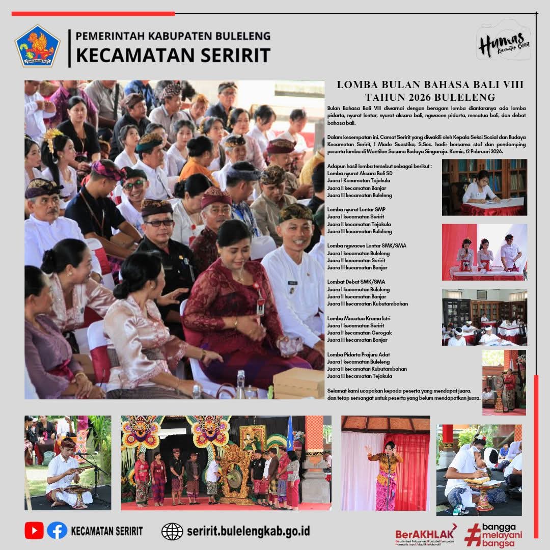 Dalam kesempatan ini, Camat Seririt yang diwakili oleh Kepala Seksi Sosial dan Budaya Kecamatan Seririt, I Made Suastika, S.Sos. hadir bersama staf dan pendamping peserta lomba di Wantilan Sasana Budaya Singaraja. Kamis, 12 Pebruari 2026.